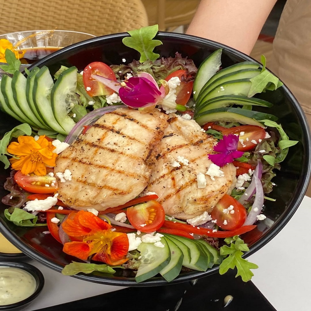 Lechuga, arugula, tomate, pepino, queso feta y proteina.