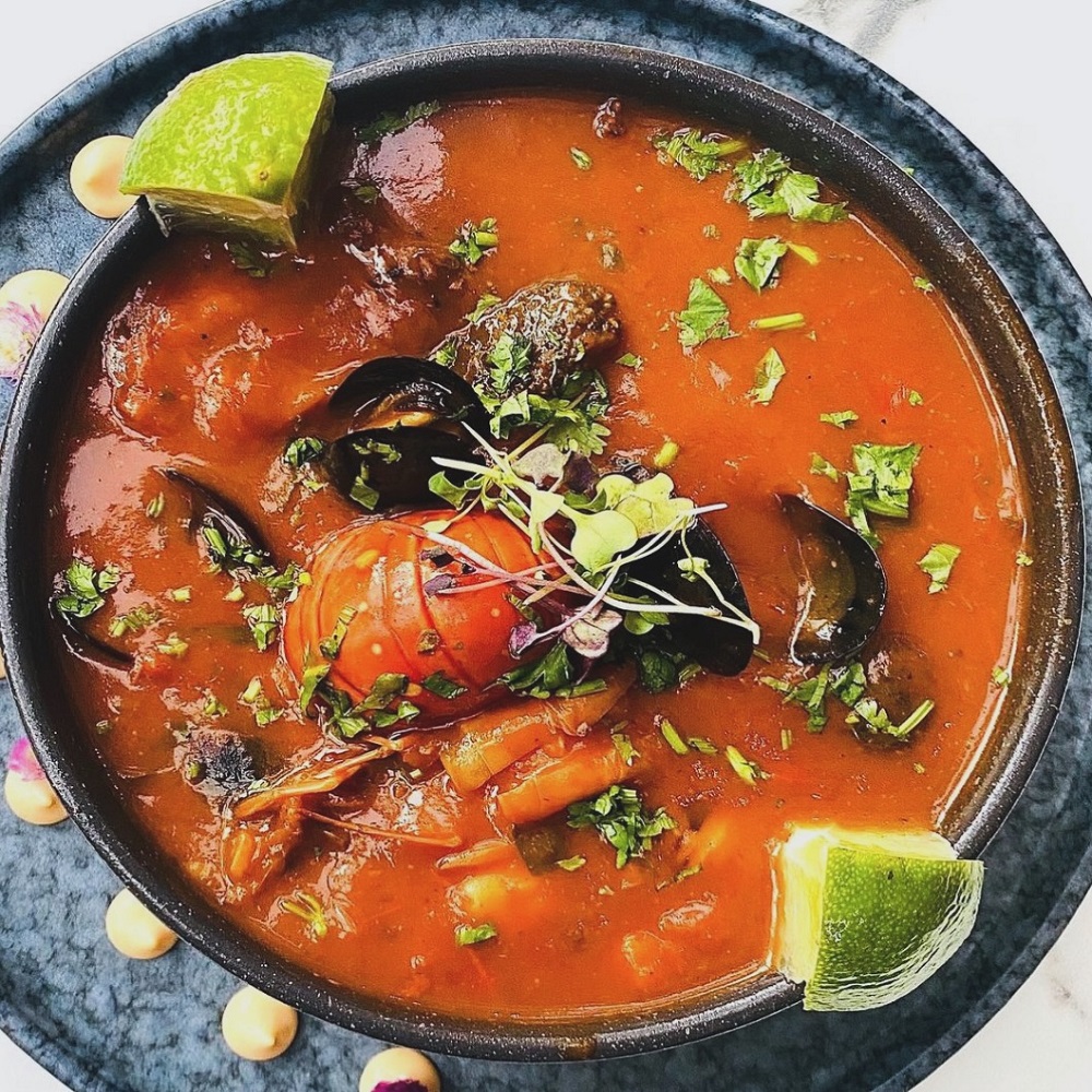 Cremoso caldo de mariscos y especies caribeñas.