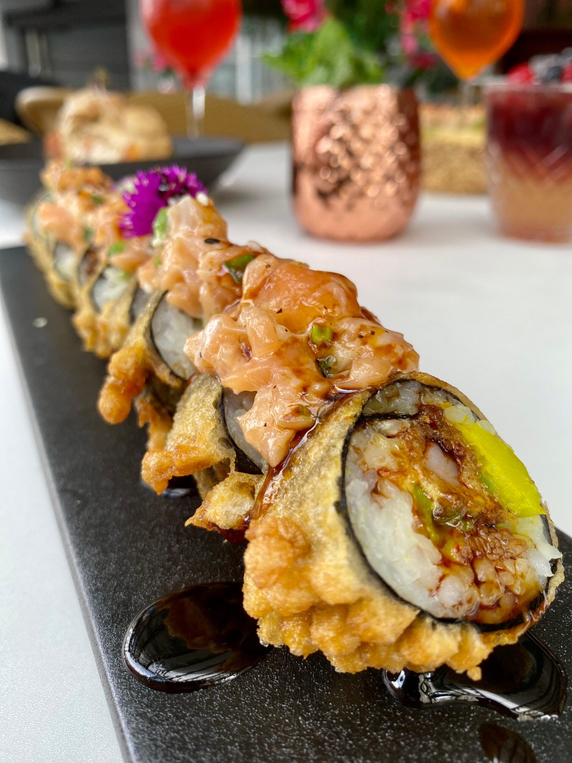 Langostinos, aguacate, cagrejo, queso crema, anguila topping salmon.