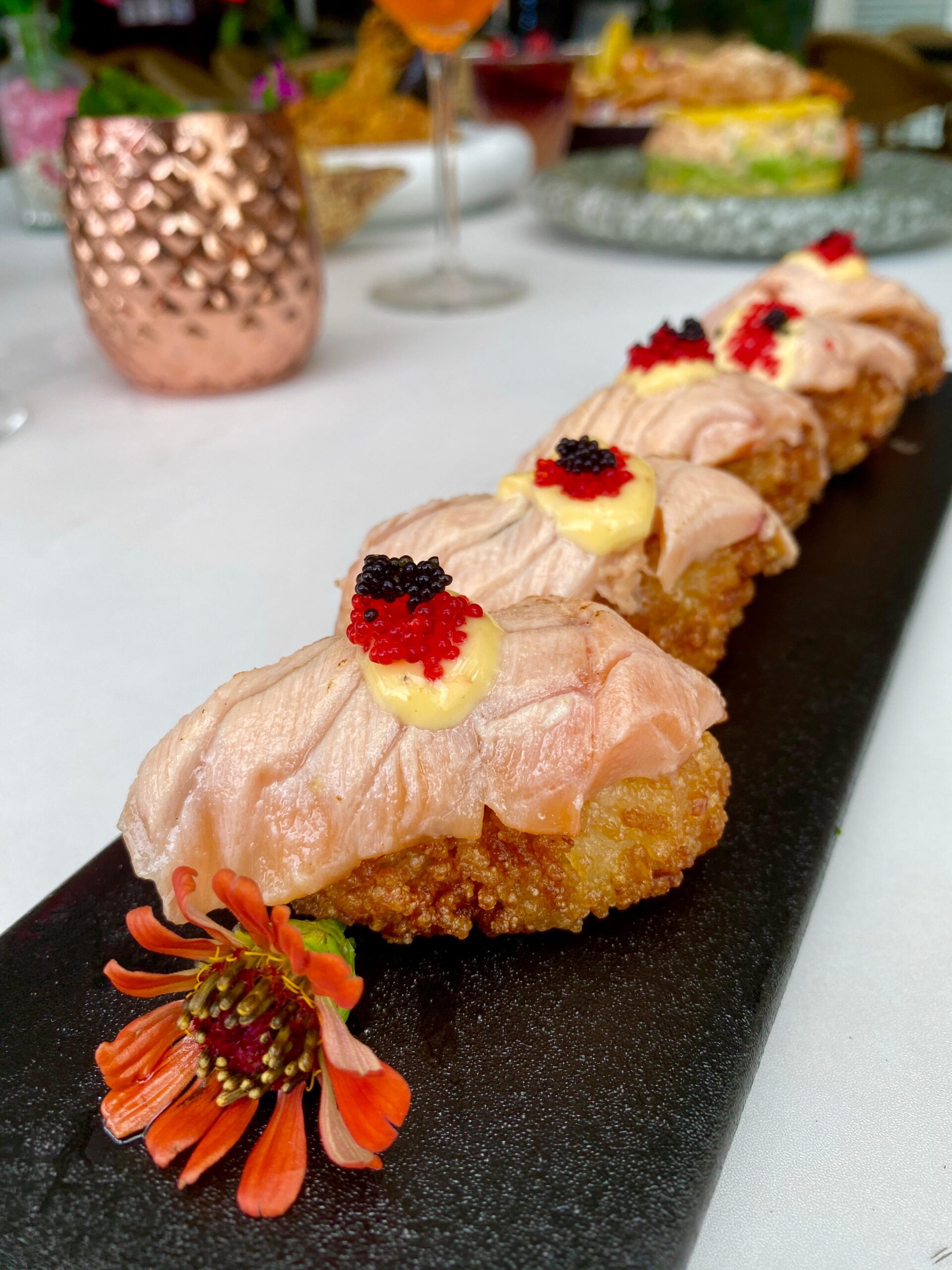 Arroz crispy con topping de salmón y tobanyan.